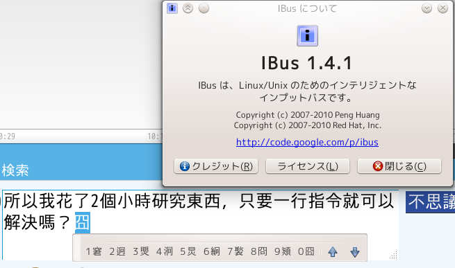 然而重新啟動後,雖然ibus可以打字和使用快速鍵切換輸入法,但是系統匣的圖示和選字區無法顯示。後來花了近2小時,試過各種的方法,可以說是死馬當活馬醫。因此我不太敢確定,到底是哪個部份修復了這個問題。