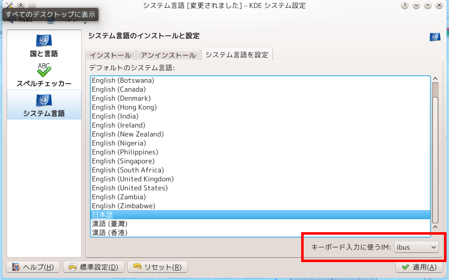 「kickoffメニュー->システム設定->ローカル->システム言語->システム言語を設定」で、入力に使うIMが設定できる。